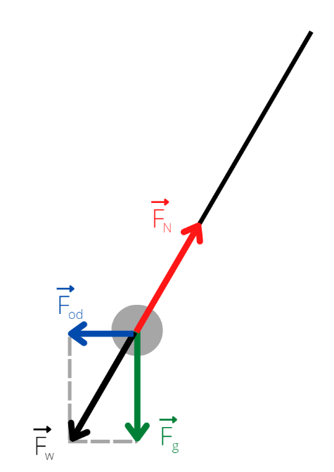 Siła dośrodkowa pochodzi od siły grawitacji i siły naciągu sznura. W układzie nieinercjalnym kulka pozostaje w spoczynku, więc wypadkowa działających na nią sił jest równa zeru.