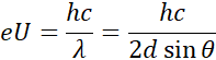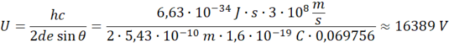 Im większe n, tym mniejsza długość fali. Zatem dla większych kątów ugięcia energia promieniowania emitowanego z atomów jest większa, bo im mniejsza długość fali, tym większa częstotliwość, a co za tym idzie – energia. Dla pierwszego wzmocnienia otrzymujesz zatem minimalne napięcie przyspieszające: