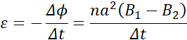W celu obliczenia SEM indukcji postępuję standardowym schematem, gdzie najpierw liczę zmianę strumienia indukcji dla dwóch wartości indukcji pola magnetycznego (dla całej cewki, tak więc pole jednego kwadratu (a2) mnożę przez liczbę zwojów, ostatecznie podstawiam zmianę do definicyjnego wzoru prawa indukcji Faradaya i wprost z tego wyliczam SEM indukcji.