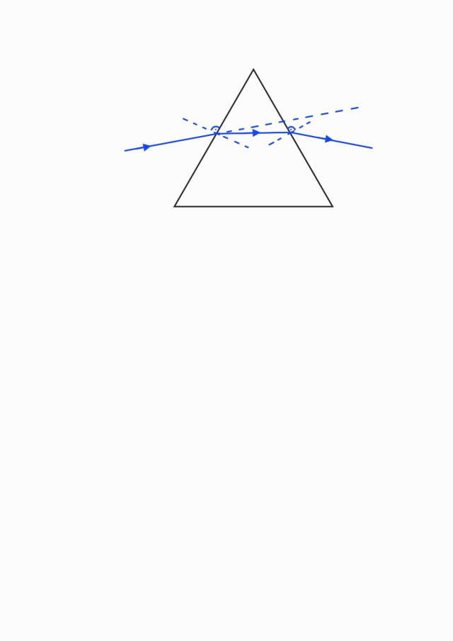 Przy przejściu przez pryzmat, światło ulega dwukrotnemu załamaniu: raz przy przejściu z powietrza do pryzmatu (wtedy promień załamuje się ku normalnej, bo przechodzi z ośrodka, w którym ma większą szybkość do ośrodka, w którym rozchodzi się wolniej), a następnie przy przejściu z pryzmatu do powietrza (tym razem promień załamany odsuwa się od normalnej, bo znów przeszedł do ośrodka, w którym może „biec” szybciej).