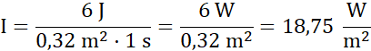 Oblicz natężenie światła jako stosunek mocy promieniowania padającego na daną powierzchnię (ustawioną prostopadle do kierunku rozchodzenia się fali elektromagnetycznej). Moc wyraź jako stosunek energii promieniowania do czasu trwania zjawiska.
