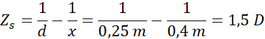 Zapisz równanie soczewki dla gołego oka oraz oka uzbrojonego w soczewkę. Połącz ze sobą oba wzory i przekształć powstałą zależność. Na koniec wstaw dane w odpowiednich jednostkach (