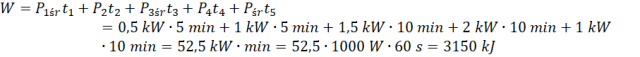 Pracę obliczamy jako iloczyn mocy i czasu. Dzielimy cały czas na 5 okresów, w których moc czasu ma taki sam przebieg.