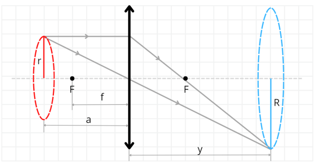 Promienie świetlne wychodzące z kulki przechodzą przez soczewkę i pojawiają się po przeciwnej stronie osi optycznej. Oznacza to, że obraz kulki będzie poruszał się w stronę przeciwną niż przedmiot.