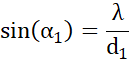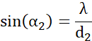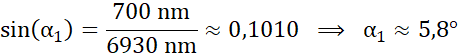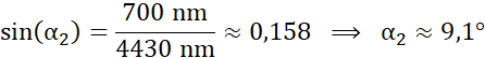 Wiedząc, że na szczeliny o szerokości d1 = 6930 nm i d2 = 4430 nm skierowano światło o długości λ = 700 nm oblicz kąt ugięcia (α1, α2) dla pierwszego minimum dyfrakcyjnego obrazów przestawionych na rysunkach zawartych w podręczniku.