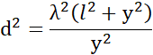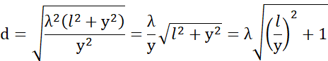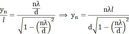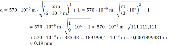 W sytuacji początkowej, gdy ekran jest oddalony o l = 2 m od pojedynczej szczeliny o szerokości d, przez szczelinę przechodzi monochromatyczne światło o długości fali λ = 570 nm. Oblicz, jak szeroka powinna być szczelina, aby pierwszy ciemny prążek widma dyfrakcyjnego znajdował się na ekranie w odległości y = 6 mm od środka obrazu szczeliny.