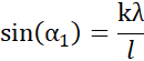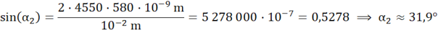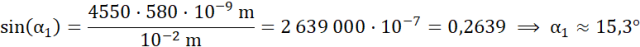 Oblicz, pod jakimi kątami ugięcia obserwuje się wzmocnienie pierwszego i drugiego rzędu, jeśli wiązka światła o długości λ = 580 nm pada prostopadle na siatkę dyfrakcyjną, w której mieści się k = 4550 rys na 1 cm długości.