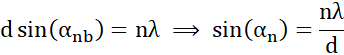 Oblicz kąt, pod jakim jest widoczna barwa niebieska światła o długości λ’ = 470 nm dla pierwszego rzędu ugięcia, jeśli światło barwy czerwonej o długości λ = 760 nm dla pierwszego rzędu ugięcia jest widoczne pod kątem α = 30°na ekranie odległym o l = 2,5 m od siatki.