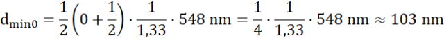 Oblicz wartości dwóch najmniejszych grubości błonki mydlanej (n = 1,33), dla których zachodzi interferencja konstruktywna promieni światła barwy zielonej o długości λ = 548 nm odbitych od dwóch powierzchni błonki.