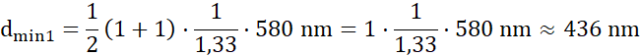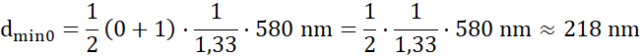 Oblicz wartości dwóch najmniejszych grubości błonki mydlanej (n = 1,33), dla których zachodzi wygaszenie promieni światła barwy zielonej o długości λ = 548 nm odbitych od dwóch powierzchni błonki.