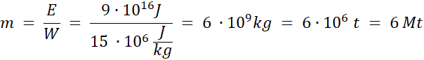 Aby obliczyć masę węgla potrzebną do uzyskania takiej ilości energii, należy podzielić energię uzyskaną a 1 kg paliwa jądrowego, przez ciepło właściwe spalania węgla, czyli ilość energii cieplnej wydzielonej w wyniku spalenia 1 kg węgla.