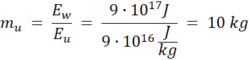 Aby dowiedzieć się, jaka masa uranu jest potrzebna, aby uzyskać równoważną ilość energii jak ze spalenia tego węgla, należy energię uzyskaną ze spalenia węgla podzielić przez energię uzyskiwaną z 1 kg uranu.