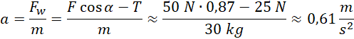 Na początku obliczamy przyspieszenie sanek, korzystając ze wzoru na siłę wypadkową na kierunku x. Następnie obliczamy drogę przebytą przez sanki w ciągu 6 s. Na koniec obliczamy pracę wykonaną przez tatę.