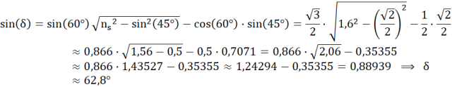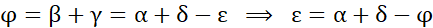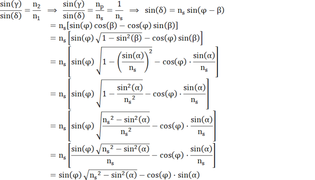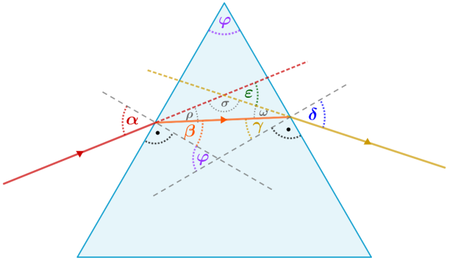 Następnie zauważ, że kąt odchylenia jest kątem zewnętrznym w trójkącie o kątach ρ, ω, więc jest on równy ich sumie. Podane kąty są z kolei związane z kątami padania i załamania na obu powierzchniach granicznych. Skorzystaj z faktu, że kąt między normalnymi do powierzchni granicznych jest równy kątowi łamiącemu pryzmatu, który z kolei jest kątem zewnętrznym do trójkąta o kątach β i γ, więc równy ich sumie.
