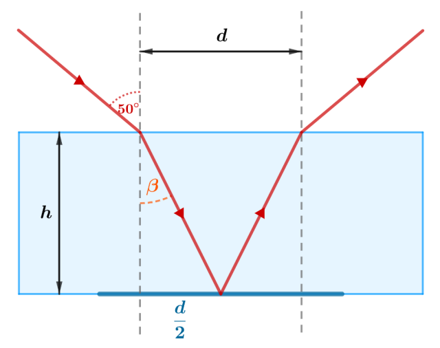 Na podstawie rysunku zamieszczonego w podręczniku oblicz, na jakiej głębokości h leży zwierciadło płaskie. Wiadomo, że prędkość światła w wodzie jest o k = 25% mniejsza niż w powietrzu.