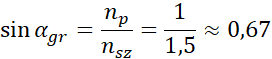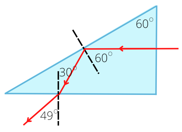 Znajdź dalszy bieg promienia światła padającego na pryzmat prostokątny. Wykonaj odpowiednie obliczenia.