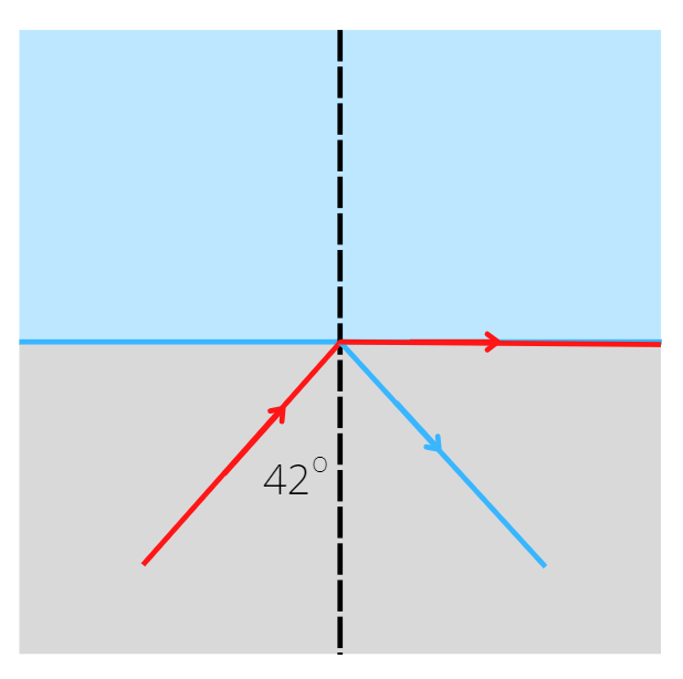 Kąt padania jest równy kątowi granicznemu. Oznacza to, że kąt odbicia