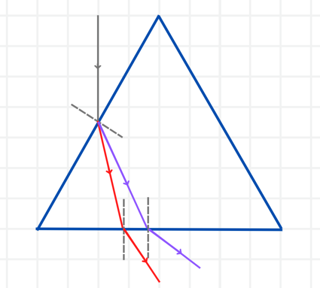 Przechodząc pomiędzy dwoma ośrodkami najmocniej od pierwotnego biegu promienia odchyla się barwa fioletowa, a najmniej czerwona.