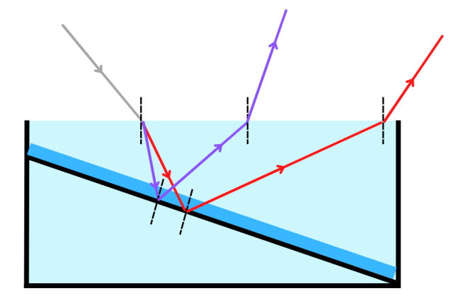 Na rysunku przedstawionym w podręczniku dorysuj dalszy bieg promienia światła. Wykonaj szkic dla co najmniej dwóch barw promieni.