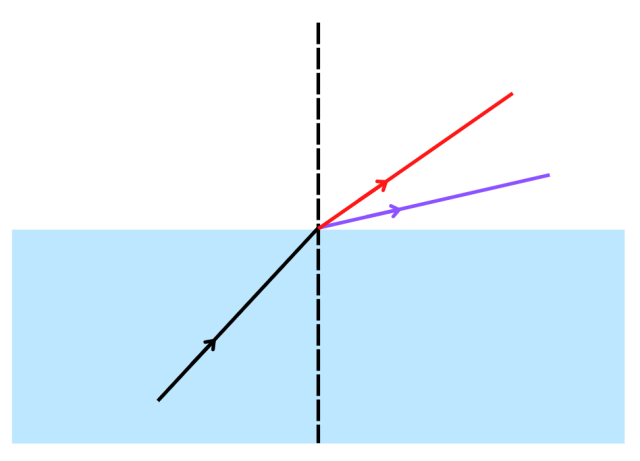 Znając wartości współczynników załamania w szkle dla światła fioletowego i czerwonego narysuj ich dalszy bieg po dotarciu na granicę ośrodków.