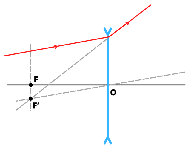 Na początku narysuj linię pomocniczą równoległą do promienia padającego i przechodzącą przez środek soczewki. Następnie poprowadź linię pionową od ogniska pozornego soczewki. Przecięcie tych dwóch linii staje się również punktem przecięcia przedłużenia promienia załamanego.