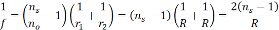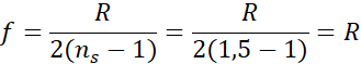 Oblicz ogniskową soczewki dwuwypukłej o jednakowych promieniach krzywizn umieszczonej w powietrzu, jeśli współczynnik załamania jej materiału wynosi