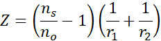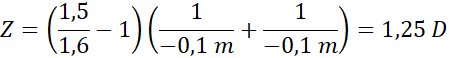 Oblicz zdolność skupiającą szklanej soczewki dwuwklęsłej o jednakowych promieniach krzywizn R = -10 cm zanurzonej w roztworze soli o współczynniku załamania