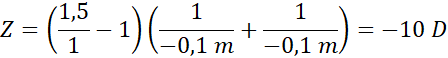 Oblicz zdolność skupiającą szklanej soczewki dwuwklęsłej o jednakowych promieniach krzywizn R = -10 cm będącej w powietrzu.