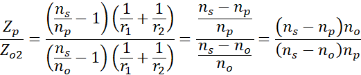 Zapisz stosunek zdolności skupiających soczewki w dwóch różnych ośrodkach. Wykorzystaj wzór soczewkowy. Przekształć go i wstaw odpowiednie dane.