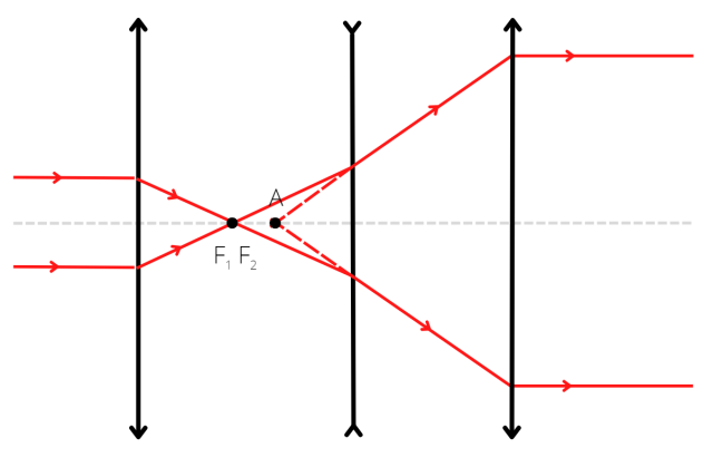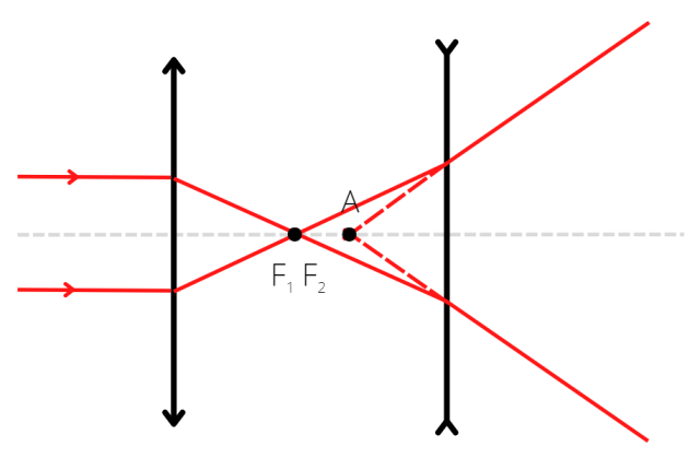 Narysuj rysunek pomocniczy. Należy wyznaczyć położenie punktu, w którym przecinają się przedłużenia promieni wychodzących z soczewki
