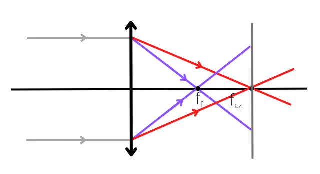 Narysuj rysunek pomocniczy, na którym zaznaczysz: położenie soczewki, promienie załamane o barwie czerwonej i fioletowej, ogniska tych promieni, ekran. Na jego podstawie wyznacz zależność trójkątów podobnych – zapisz ją i wyznacz wzór na średnicę okręgu otrzymanego na ekranie.