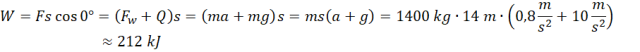 Wiedząc, że dźwig podnosi płytę betonową o masie 1400 kg na wysokość 14 m z przyspieszeniem o wartości 0,8 m/s2 oblicz pracę, jaką przy tym wykonał.