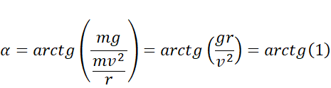 Siła wypadkowa prostopadłych sił: bezwładności i grawitacji wyznacza kąt nachylenia motocyklisty. Uzależnij, przy pomocy zależności trygonometrycznych, siły te od naciągu. Oblicz stosunek ciężaru i siły dośrodkowej, by wyznaczyć tangens kąta wychylenia (siła grawitacji się skraca). Znajdź kąt.