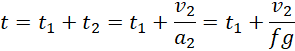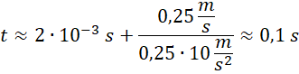 Czas poruszania się pocisku jest sumą czasu, w którym pocisk przebijał się przez zwał piasku, i w którym przesuwał drewniany klocek. Wstawiamy odpowiedni wzór na czas drugi, korzystając z obliczeń wykonanych w punkcie a.