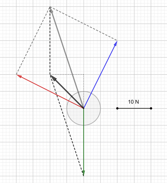 Wypadkową sił nierównoległych wyznacz zgodnie z regułą równoległoboku - początki wektorów zaczepiamy w jednym punkcie, a one same tworzą dwa boki równoległoboku, kolejno dwa pozostałe dorysowujemy. Przekątna powstałej figury jest wektorem wypadkowym. Zauważ, że wektor wypadkowy jest przekątną kwadratu o boku dwóch kratek (10 N). przekątna kwadratu wyrażana jest jako: a