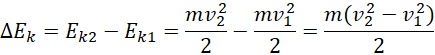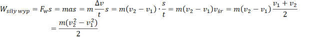 Korzystamy ze wzoru na energię kinetyczną, rozpisując jej wartość. Rozkładamy na czynniki również wartość pracy wykonanej przez siłę wypadkową. Stosunek drogi do czasu to prędkość średnia.