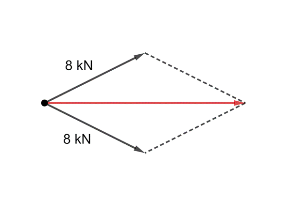 Wyznaczamy wypadkową zgodnie z regułą równoległoboku. Następnie mierzymy długości wektorów składowych i wypadkowego. Za pomocą proporcji wyznaczamy wartość wektora wypadkowego.