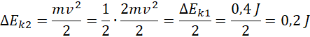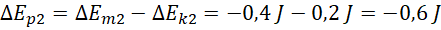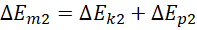 Prędkość klocka 1 i 2 jest taka sama, więc zapisujemy przyrost energii kinetycznej drugiego klocka za pomocą przyrostu energii kinetycznej pierwszego klocka. Przyrost energii potencjalnej obliczamy, wiedząc, że suma przyrostów energii kinetycznej i potencjalnej jest równa spadkowi energii mechanicznej tego klocka.