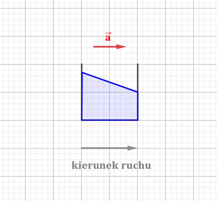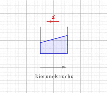 Gdy wózek przyspiesza, to woda zostaje dociśnięta do tylnej ścianki (przeciwnie do kierunku ruchu). Natomiast, gdy wózek hamuje, to woda „leci” na przednią ściankę (zgodnie z kierunkiem ruchu).