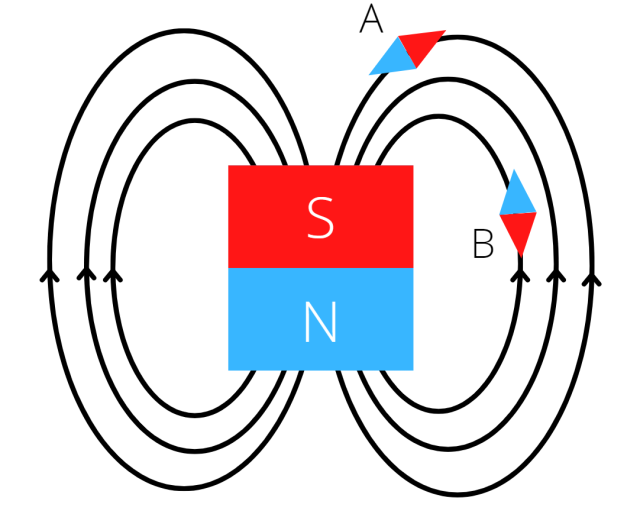 Narysuj linie pola magnetycznego pochodzącego od magnesu neodymowego i ustawienie igieł magnetycznych umiejscowionych w punktach A i B.