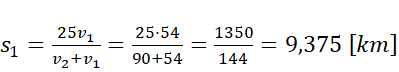 Samochody wyjeżdżając ze stacji i spotykając się równocześnie, przebywają różne drogi, ale w tym samym czasie. Przekształć wzór na drogę w ruchu jednostajnym tak, aby otrzymać czas. Czas dla obu samochodów jest taki sam, otrzymane stosunki przyrównaj więc do siebie. Podczas gdy samochód z A pokona drogę s, samochód jadący z B pokona drogę 25 km-s. Podstaw to wyrażenie do otrzymanego wcześniej równania. W ten sposób, po odpowiednich przekształceniach algebraicznych otrzymasz wartość drogi od stacji A. Następnie z przekształconego wcześniej wzoru oblicz czas. Pamiętaj o zamianie jednostek.