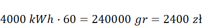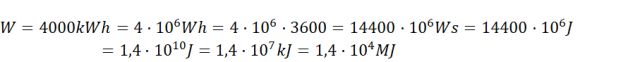 Przelicz pracę wykonaną przez prąd z kWh na dżule. Zrobisz to mnożąc wartość pracy przez 3600 s. Następnie zamień jednostki, wiedząc, że Mega oznacza 106, a kilo 103. NA koniec oblicz koszt, mnożąc liczbę zużytych w ciągu roku kWh przez koszt 1 kWh.