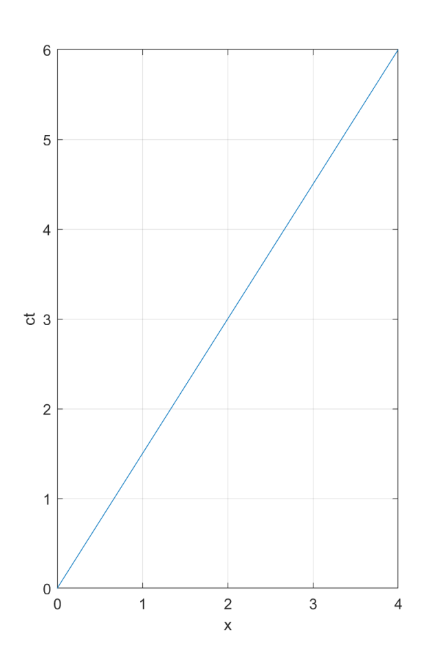 Pociąg jedzie ze stałą prędkością, więc wartość przebytej przez niego drogi zwiększa się proporcjonalnie do czasu. Pociąg jedzie z prędkością mniejszą niż prędkość światła, więc kąt nachylenia wykresu do poziomu w dwuwymiarowej czasoprzestrzeni musi być większy niż 45°.