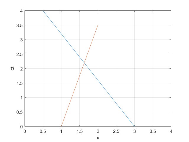 Oba samochody poruszają się ruchem jednostajnym, więc wykresy przedstawiające ich trajektorie w dwuwymiarowej czasoprzestrzenie są liniami prostymi. Przemieszczenie samochodu oznaczonego na niebiesko maleje, a oznaczonego na pomarańczowo rośnie. Samochody jadą z prędkością mniejszą niż prędkość światła, więc kąt nachylenia wykresów do poziomu musi być większy niż 45°.