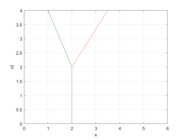 W początkowym stadium (niebieski wykres) przemieszczenie nie zmienia się w czasie. W momencie odrzutu pocisk i działo poruszają się w przeciwnych kierunkach, ruchem jednostajnym z różną prędkością. Oba obiekty poruszają się z prędkością mniejszą niż prędkość światła, więc kąt nachylenia wykresów do poziomu musi być większy niż 45°.