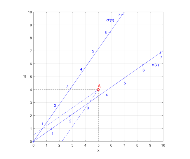 Na początku znajdź równanie opisujące położenie osi po transformacji Lorentza. Następnie narysuj je na wykresie. Wyskaluj osie, korzystając z wyników uzyskanych w podpunkcie a). Na koniec określ współrzędne punktu A w nowym układzie poprzez linie równoległe do osi układu. Odczytaj przybliżoną wartość, gdzie równoległa przecina się z drugą osią.