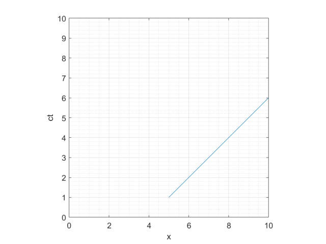 Punkt pojawienia się fotonu to (5,1), więc z niego rozpoczyna się rysowanie wykresu. Foton porusza się z prędkością równą prędkości światła , dlatego dalsza część wykresu jest nachylona pod kątem 45° do poziomu.