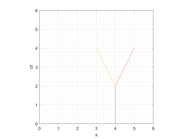 Na początku istnieje nieruchomy kwant – wykres niebieski. Następnie powstaje elektron i pozyton. Oblicz zależność między przyrostem położenia , a przyrostem . Skorzystaj z otrzymanych zależności i narysuj odpowiednie wykresy, rozpoczynając w punkcie (4,2). Elektron – czerwony, pozyton – żółty.