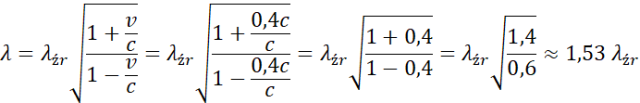 Przesunięcie ku czerwieni to różnica między długością fali wysyłanej ze źródła, a długością mierzoną na Ziemi. Do jej obliczenia zastosuj wzór przedstawiający efekt Dopplera w mechanice relatywistycznej dla oddalającego się ciała. Wstaw odpowiednie liczbowe i wykonaj obliczenia.