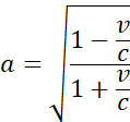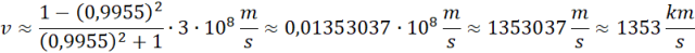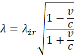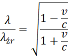 Na podstawie danych z treści zadania wyznacz wartość długość fali widocznej na Ziemi. Następnie, wiedząc, że źródło zbliża się do obserwatora, zastosuj wzór Dopplera dla mechaniki relatywistycznej. Przekształć go, wstaw odpowiednie dane i wykonaj obliczenia.